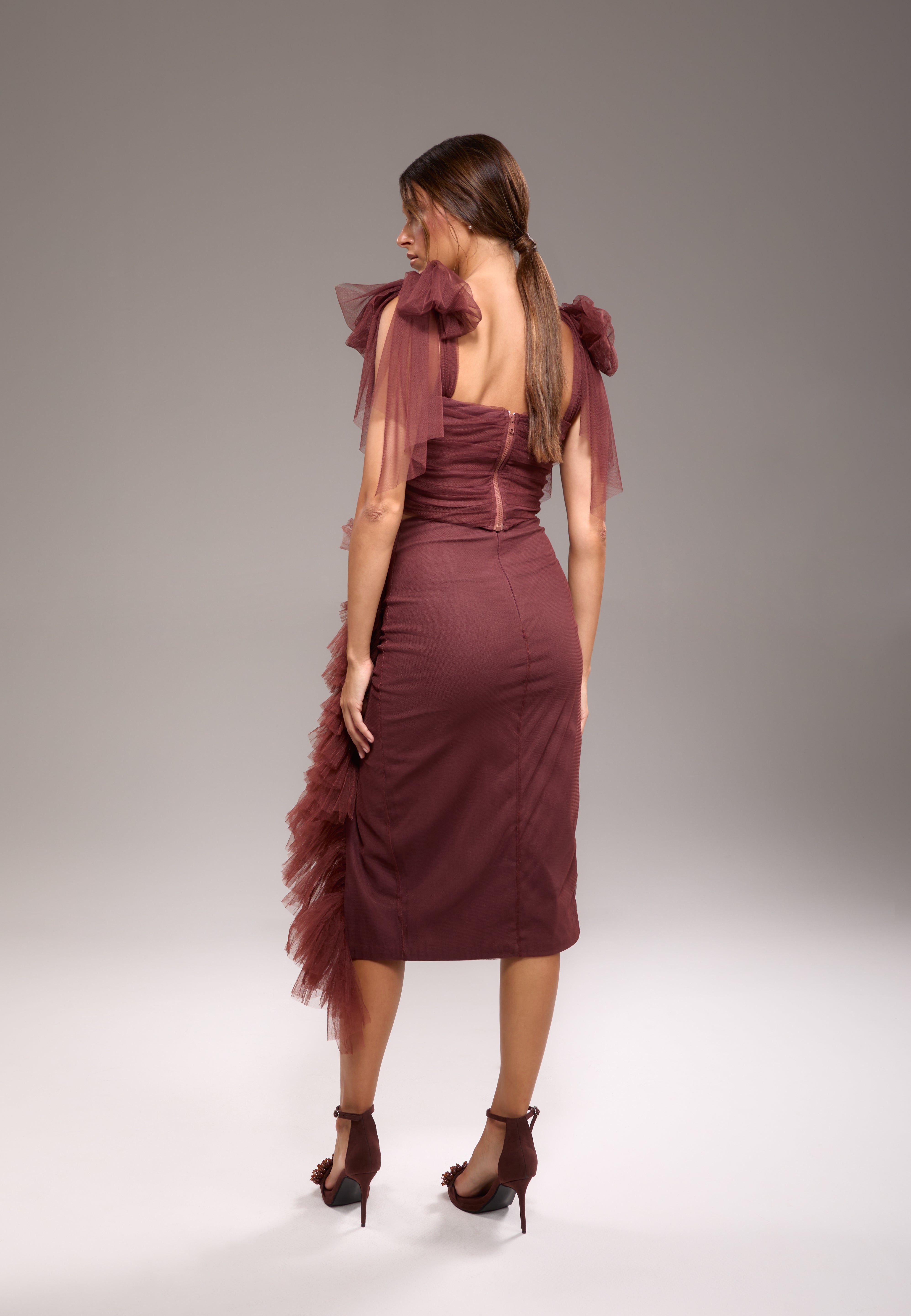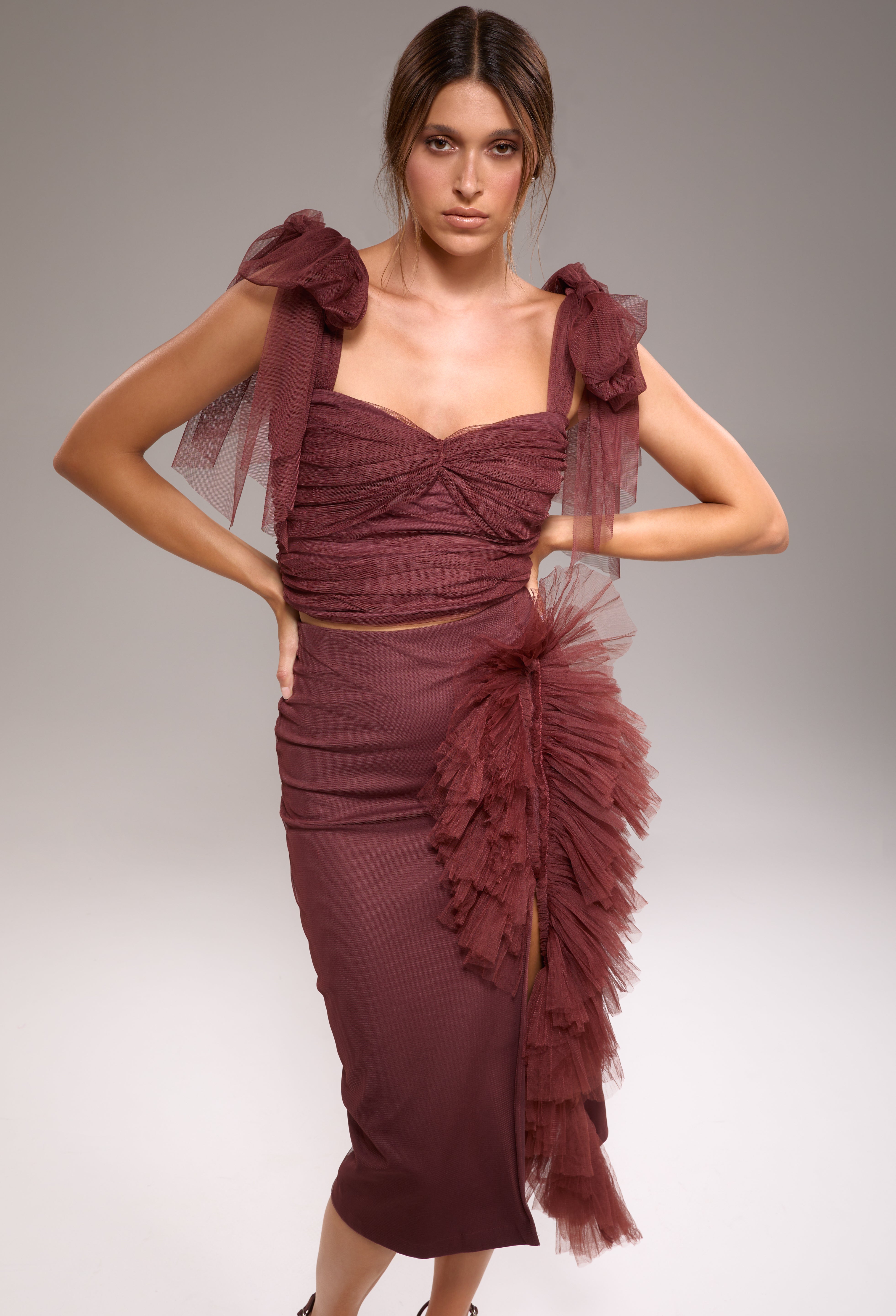 The Karola Skirt is the show-stopping pair to the Karola Bustier. It’s elegance shines through with it’s intricate tulle details, and it’s midi length makes it the perfect piece to have in your closet.